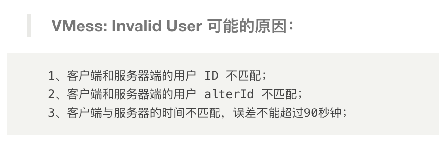 VMess: Invalid User -V2Ray 错误信息VMess: Invalid User 可能的原因: 1、客户端和服务器端的用户 ID 不匹配; 2、客户端和服务器端的用户 alterId 不匹配; 3、客户端与服务器的时间不匹配,误差不能超过90秒钟;