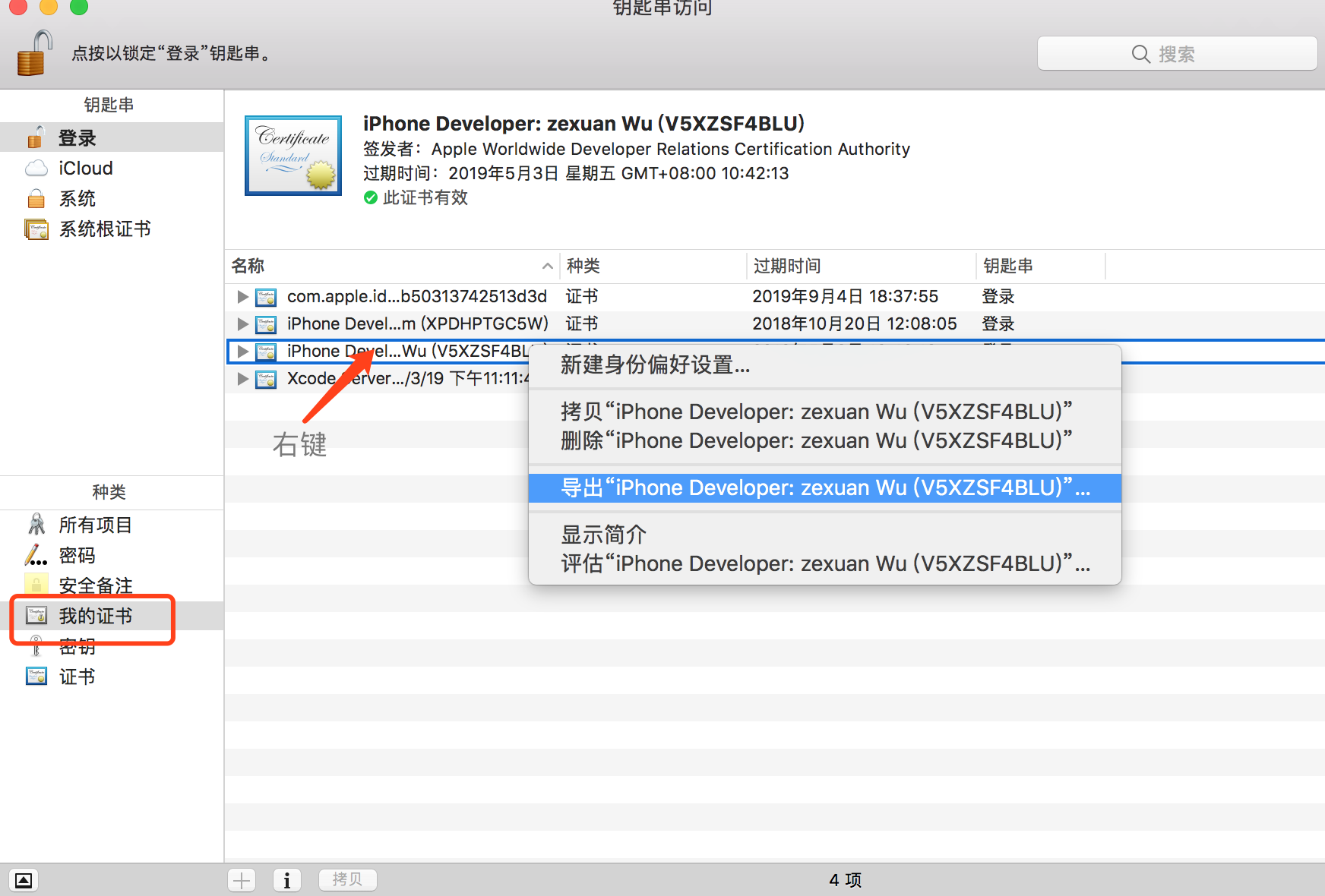 在我的证书中 选择你的iOS测试证书-右键-选择导出-弹出密码选择 可以输入可以不输入-然后确认